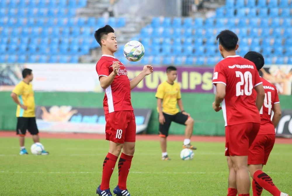 Các cầu thủ dự bị tập riêng ở cầu môn phía Tây sân Bình Dương, trong khi đó đội hình A như Văn Quyết, Anh Đức, Văn Thanh, Công Phượng, Duy Mạnh, Xuân Trường, Quang Hải… tập ở nửa phần sân phía Đông.