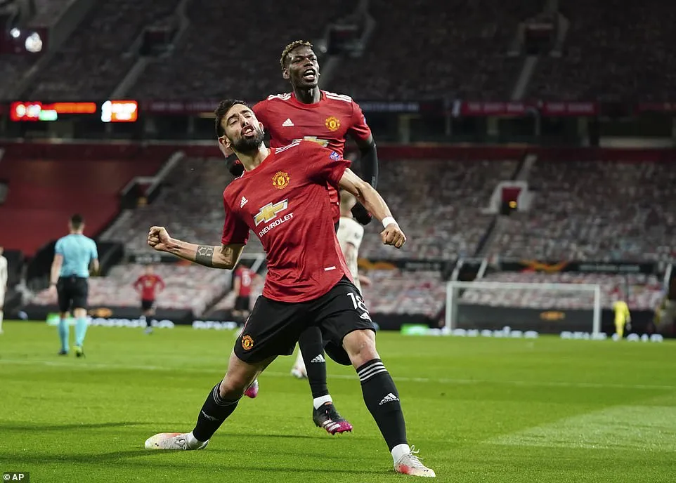 Bruno Fernandes và Paul Pogba đã cùng nhau tạo nên bàn thắng nâng tỉ số lên 5-2 cho MU. ẢNH: AP