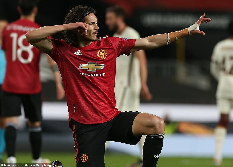Cavani thể hiện màn ăn mừng bắn cung quen thuộc. ẢNH: GETTY