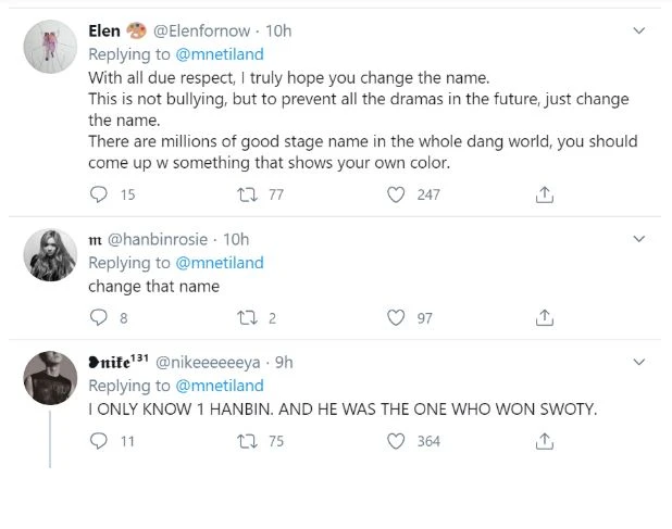 Hiện tại các fan của iKON đang rất phẫn nộ và tỏ ra không hài lòng khi bình luận dưới bài đăng về Hanbin trên Twitter chính thức của show I-LAND đề nghị Big Hit đổi tên nam thực tập sinh này.