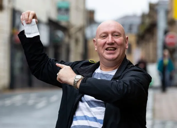 Ông Tony Ward giơ cao chiếc vé trúng thưởng. ẢNH: THE SUN