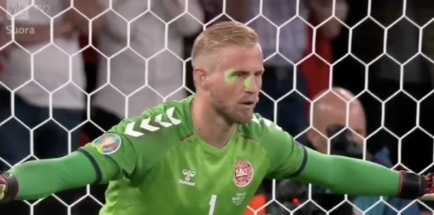 Schmeichel bị chiếu laser vào mặt. ẢNH: ITV, SUORA