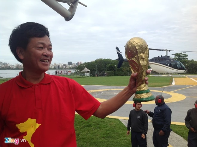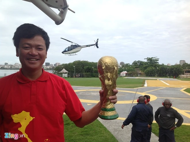 CĐV Văn Trần Hoàn với biệt danh Hoàn "pháo" có mặt tại Brazil từ ngày 1/7 để dự khán các trận đấu thuộc vòng tứ kết World Cup. Sau những trận đấu với góc nhìn thông thường từ trên khán đài, CĐV đặc biệt này phá cách bằng việc thuê trực thăng để xem bóng đá từ trên cao.