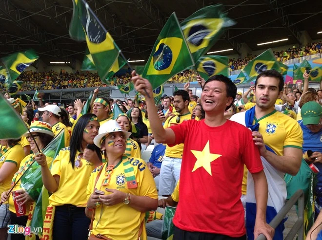 CĐV với chiếc áo cờ đỏ sao vàng nổi bật giữa rừng cờ vàng - xanh của CĐV nước chủ nhà Brazil.