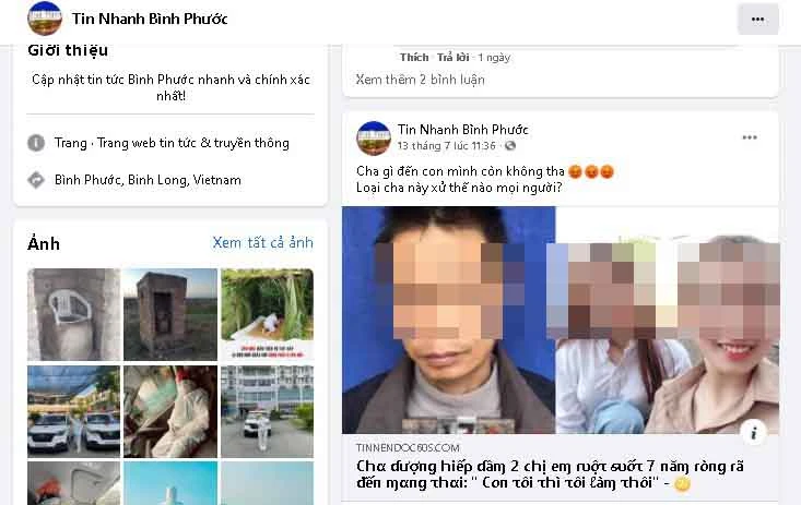 Trước đó, hai cô gái trẻ cùng 21 tuổi ngụ tỉnh Bình Phước phát hiện hình ảnh của mình được gắn với bài viết “cha dượng hiếp dâm 2 chị em ruột trong suốt 7 năm ròng rã đến mang thai...” được đăng tải trên fanpage “Tin nhanh Bình Phước”. Fanpage này có hơn 10.600 lượt theo dõi.