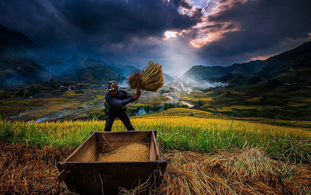 Ở nơi ấy, trong không khí se se lạnh đầu thu, những thửa ruộng bậc thang cao vút tầng mây đang vào vụ thu hoạch, dần chuyển từ xanh thắm sang óng vàng, tựa như những dải lụa mềm mại trải dài từ chân núi đến tận chân trời.