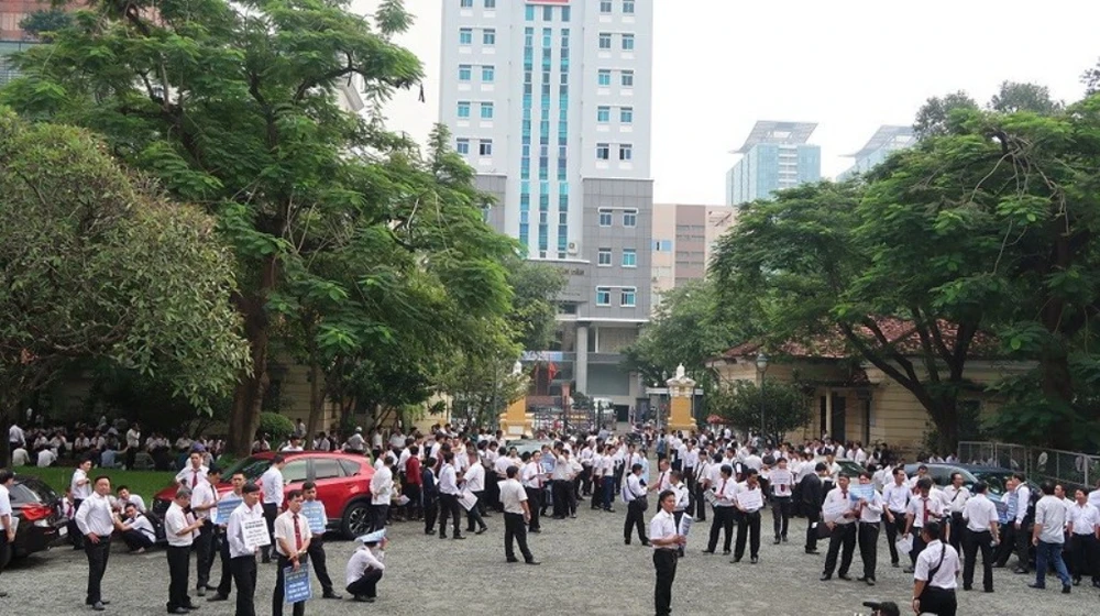 Nhiều tài xế taxi truyền thống tập trung tại sân tòa ở TP.HCM trong một phiên xử gần đây giữa Vinasun và Grab. Ảnh: PHƯƠNG LOAN