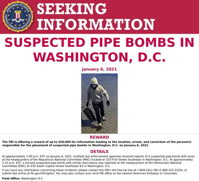 Cục Điều tra Liên bang Mỹ (FBI) đã đưa ra khoản thưởng 50.000 USD để có thông tin dẫn đến “định vị, bắt giữ và kết tội” bất kỳ ai chịu trách nhiệm việc đặt các thiết bị nghi là bom ống gần trụ sở Ủy ban Quốc gia đảng Cộng hòa và Ủy ban Quốc gia đảng Dân chủ ở thủ đô Washington D.C. hôm 6-1.