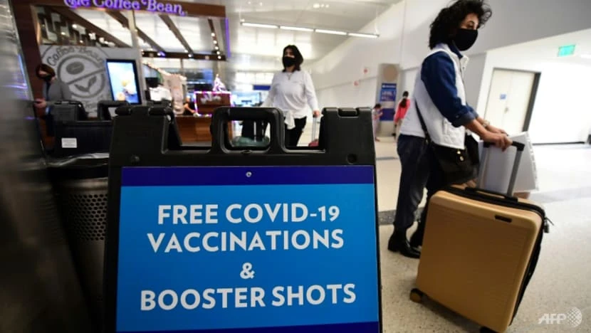Du khách đi ngang qua một tấm biển ghi dòng chữ cung cấp vaccine COVID-19 miễn phí và các mũi tiêm tăng cường tại một phòng khám ở khu vực dành cho khách quốc tế của Sân bay Quốc tế Los Angeles. Ảnh: AFP