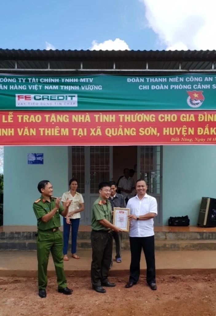 Vừa qua, FE CREDIT đã phối hợp với Đoàn Thanh niên Công an tỉnh Đắk Nông và Chi đoàn Thanh niên Phòng Cảnh sát hình sự (PCSHSĐ) Công an tỉnh bàn giao nhà tình thương cho ông Đinh Văn Thiêm tại xã Quý Sơn, huyện Đắk Glong, tỉnh Đắk Nông.