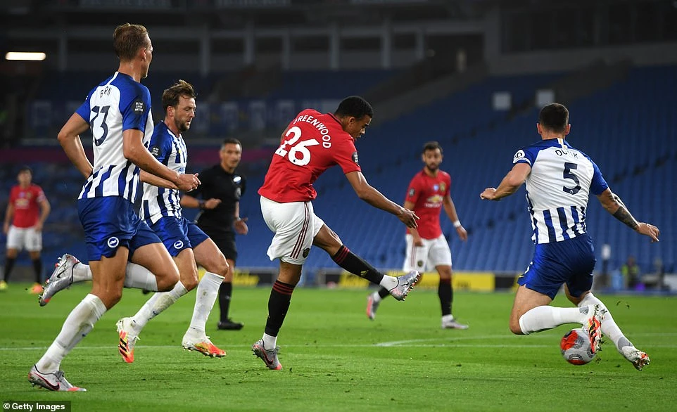 Sau pha dứt điểm chạm cột dọc của Bruno Fernandes, Man. United cũng có được bàn thắng mở tỉ số chỉ 4 phút sau đó do công của Mason Greenwood. Phút 16 Mason Greenwood có pha đi bóng táo bạo xâm nhập vòng cấm của Brighton, cầu thủ trẻ người Anh bất ngờ có pha dứt điểm đưa bóng vào góc hẹp khung thành giúp Man. United mở tỉ số 1-0.