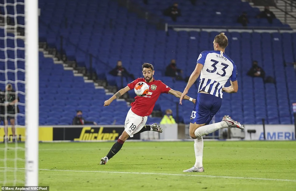 Ngay phút 12, các ngôi sao của Man. United làm chao đảo khung thành của Brighton bằng pha dứt điểm trước vòng cấm của Bruno Fernandes. Bóng từ chân tiền vệ người Bồ Đào Nha đi rất căng nhưng lại tìm đúng cột dọc khung thành.