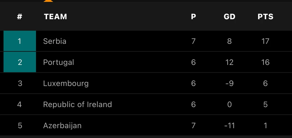 Ở cặp đấu còn lại của bảng A, Serbia thắng Azerbaijan 3-1 để có được ngôi đầu bảng với 17 điểm sau 7 vòng đấu. Với chiến thắng 5-0 trên sân nhà trước Luxembourg, Bồ Đào Nha có được 16 điểm và xếp thứ hai bảng A khi kém Serbia 1 điểm. Tuy nhiên đội bóng của HLV Fernando Santos thi đấu ít hơn Serbia 1 trận.
