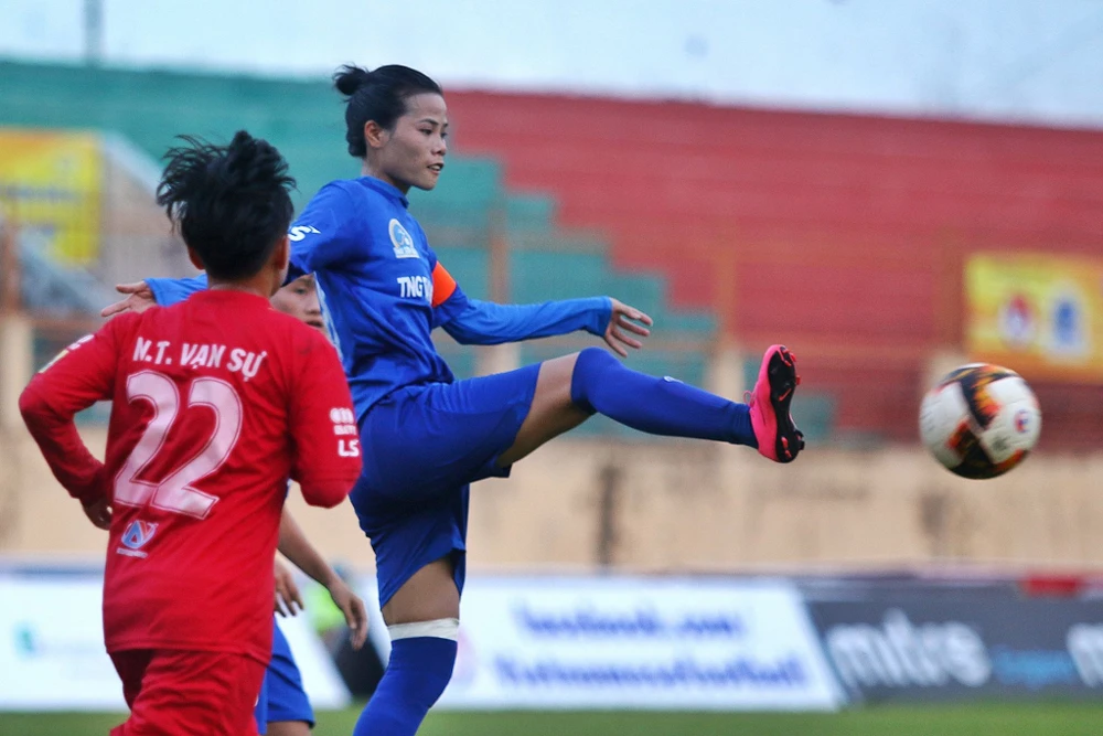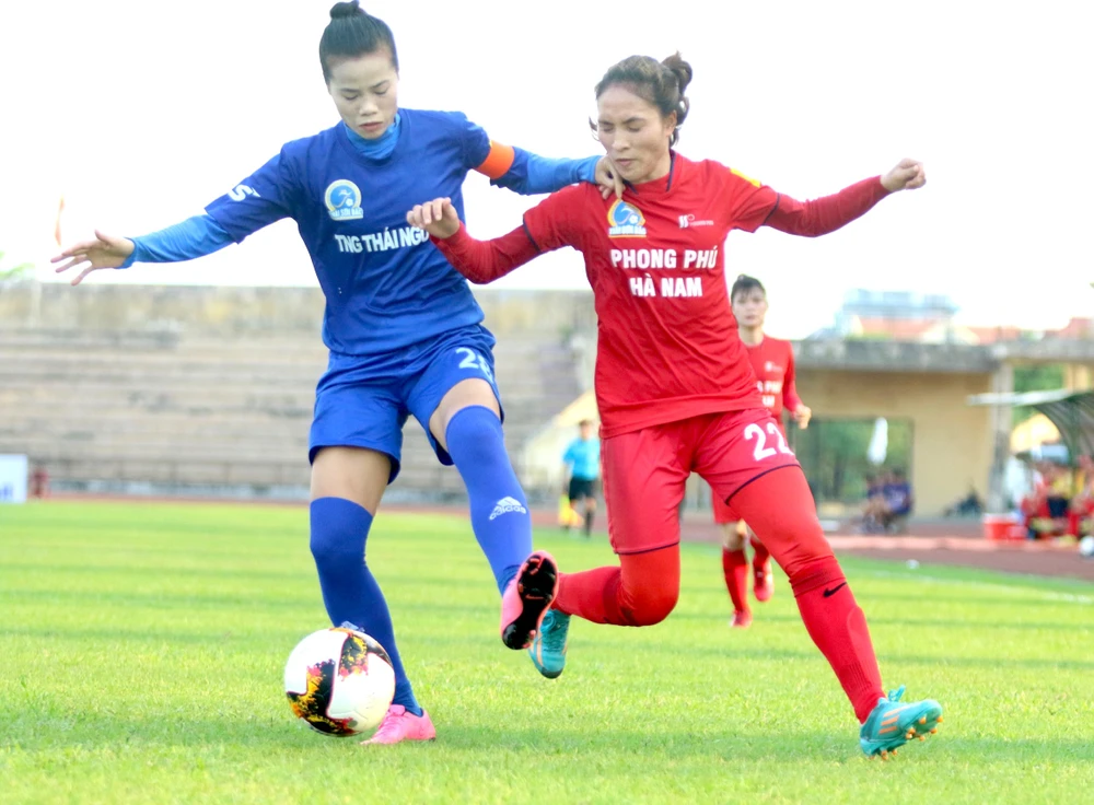 Trong năm 2019, đội bóng nữ Thái Nguyên (xanh) đoạt HCĐ Cúp Quốc gia. Ảnh: CMQ