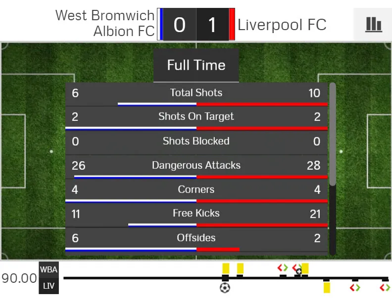 Thống kê cho thấy đây là trận đấu cả hai tung ra khá nhiều pha dứt điểm về phía khung thành của nhau, phía Liverpool là 10 còn West Brom là 6. Tuy nhiên, cả hai chỉ có đúng 2 cú sút trúng đích về phía khung thành của nhau và Liverpool là đội có được bàn thắng duy nhất trận đấu.