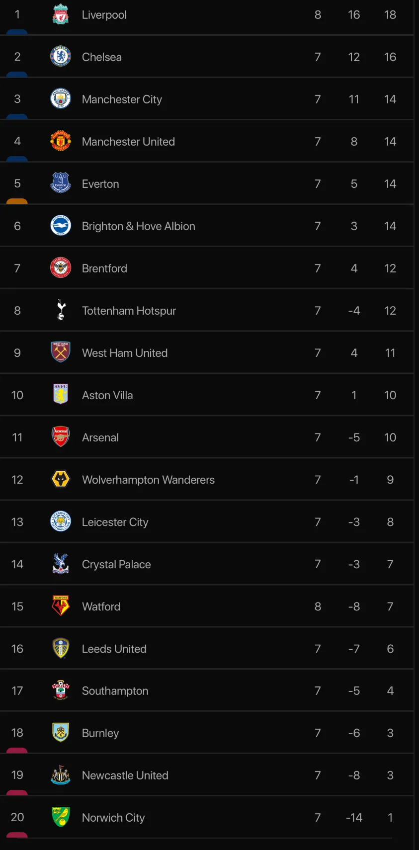 Giành chiến thắng tưng bừng 5-0 trên sân Watford, Liverpool tạm vươn lên ngồi đầu bảng sau 8 vòng đấu với 16 điểm. Tại vòng 8 Premier League, MU sẽ đến làm khách trên sân của Leicester City, Man. City tiếp đón Burnley trên sân nhà Etihad và Chelsea đến làm khách trên sân Brentford.