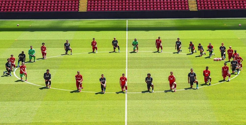 Cầu thủ Liverpool quỳ gối tưởng nhớ và phản đối hành động làm chết George Floyd của cảnh sát Mỹ.