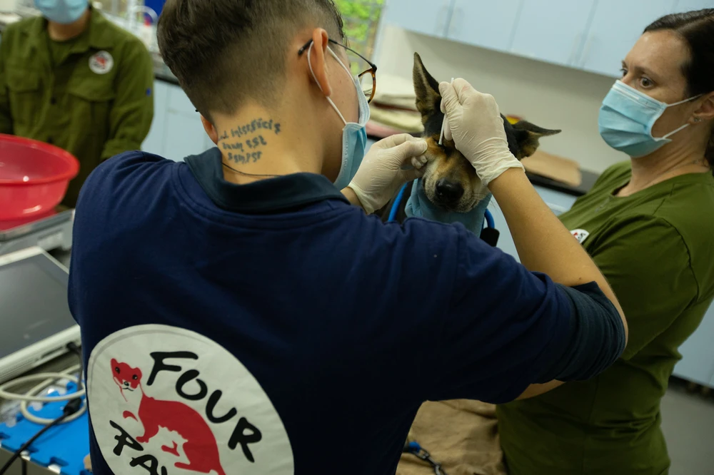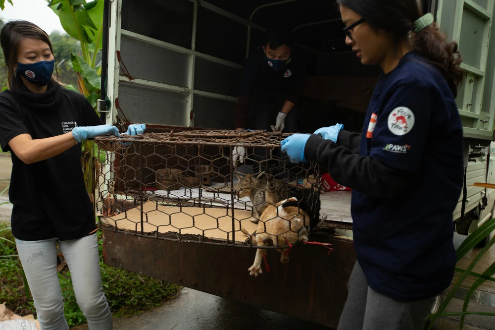 FOUR PAWS đã đưa những con chó, mèo được giải cứu về Cơ sở bảo tồn gấu của tổ chức ở Ninh Bình, nơi các bác sĩ thú y đã kịp thời chăm sóc y tế khẩn cấp cho những con vật này. Sau khi được điều trị và phục hồi chức năng, chúng sẽ được nhận về làm vật nuôi trong các gia đình. Mỗi năm, khoảng năm triệu con chó và một triệu con mèo bị giết mổ dã man để lấy thịt ở Việt Nam, phần nhiều trong số đó là vật nuôi bị đánh cắp.