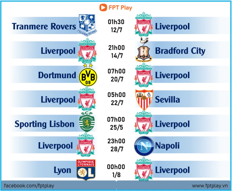 Lịch thi đấu cụ thể của Liverpool