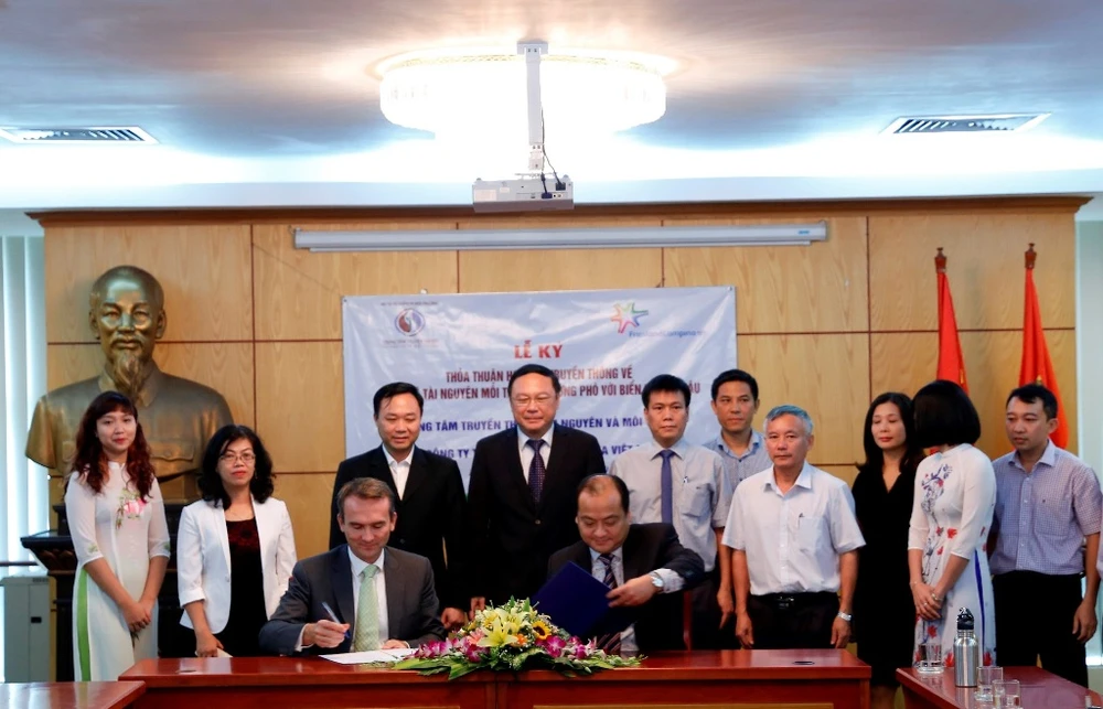 Ông Arnoud van den Berg, TGĐ FrieslandCampina VN (trái, ngồi) và ông Nguyễn Việt Dũng, GĐ Trung tâm Truyền thông Tài nguyên và Môi trường