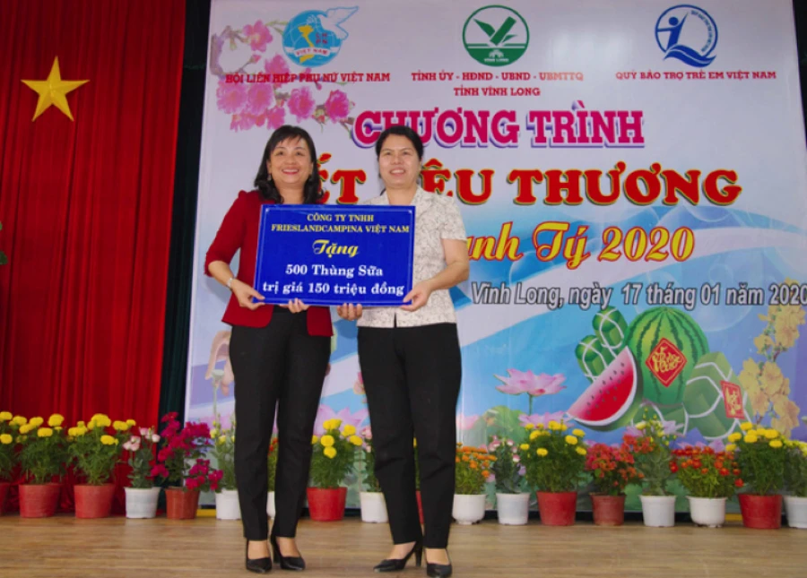 Năm nay, FrieslandCampina Việt Nam hỗ trợ hơn 1.700 thùng sữa, trị giá khoảng 500 triệu đồng để làm quà tết cho các gia đình có hoàn cảnh khó khăn ở 13 tỉnh, thành. Riêng tại Vĩnh Long, FrieslandCampina Việt Nam và Hội Liên hiệp Phụ nữ đã trao tặng 500 thùng sữa, trị giá khoảng 150 triệu đồng.