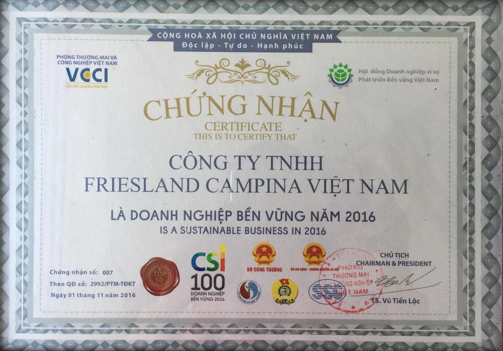 Tại lễ công bố Bảng xếp hạng 100 doanh nghiệp bền vững Việt Nam năm 2016, FrieslandCampina Việt Nam (FCV) được vinh danh trong bảng xếp hạng Top 10 “Doanh nghiệp Bền vững Việt Nam 2016” lĩnh vực sản xuất và Top 10 trong lĩnh vực dịch vụ vì những đóng góp tích cực cho các chương trình và hỗ trợ cộng đồng doanh nghiệp phát triển bền vững tại Việt Nam.