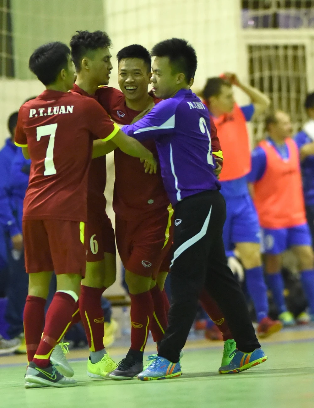 Văn Vũ cùng đồng đội ăn mừng bàn thắng. Ảnh: Quang Thắng.