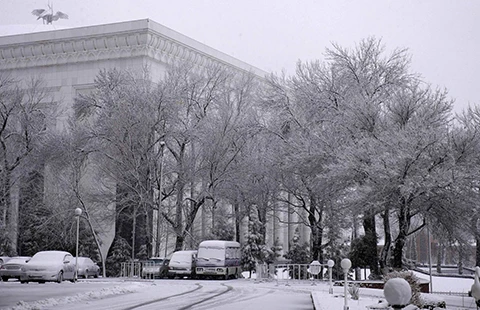 Đường phố và quảng trường ở Uzbekistan trong những ngày đầu năm dày đặc tuyết phủ trắng xóa.