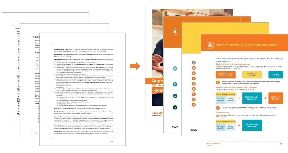 Xuất phát từ định kiến của khách hàng về hợp đồng bảo hiểm nhiều điều khoản luôn phức tạp, chứa đầy thuật ngữ kỹ thuật chuyên ngành gây khó hiểu, FWD đã nghiên cứu và rà soát lại toàn bộ các nội dung, chỉnh sửa, cải tiến và sắp xếp lại để phù hợp với thói quen và xu hướng đọc thông tin của số đông. FWD sử dụng thêm hình minh họa, các biểu tượng, hình vẽ; sử dụng các từ ngữ đơn giản, dễ hiểu; chuyển các câu ghép thành các câu đơn; trình bày nội dung theo từng nhóm chủ đề chuyên biệt; giải thích thuật ngữ ngay tại chỗ…