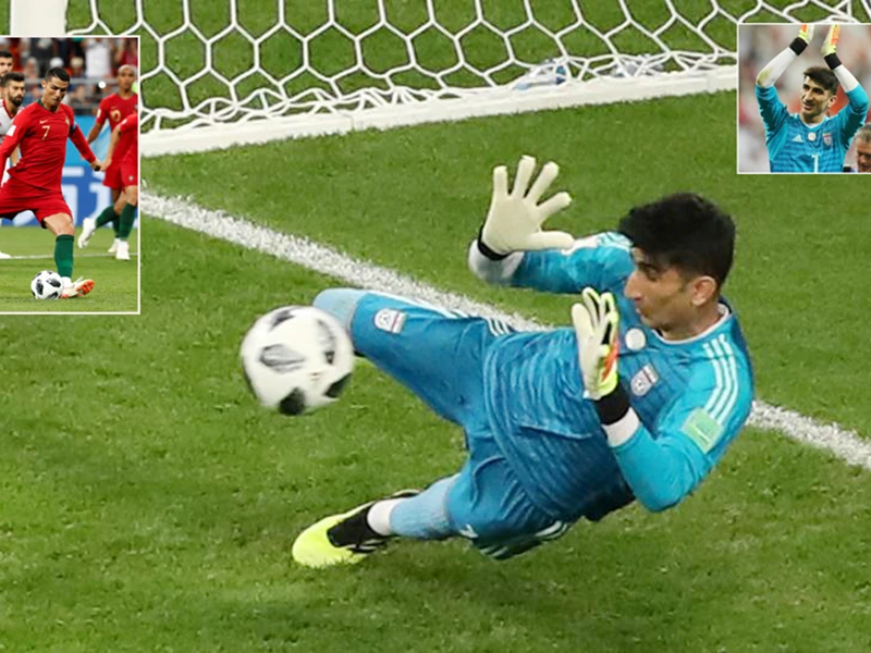 | Khoảnh khắc xuất thần của Beiranvand Khi Beiranvand nhìn thẳng vào mắt Ronaldo chuẩn bị sút quả phạt đền ở phút 54, anh cũng thấy anh là một người đàn ông bình tĩnh nhất trong sân vận động. Một pha vặn người sang phải như để lấy đà, Beiranvand đổ sang phía trái của mình, vồ lấy quả bóng. Ronaldo ôm mặt sửng sốt trong khi người Iran xúc động ôm chầm lấy nhau, rơi nước mắt. Beiranvand đã biến chân sút số một thế giới thành một gã hề trong tích tắc. |