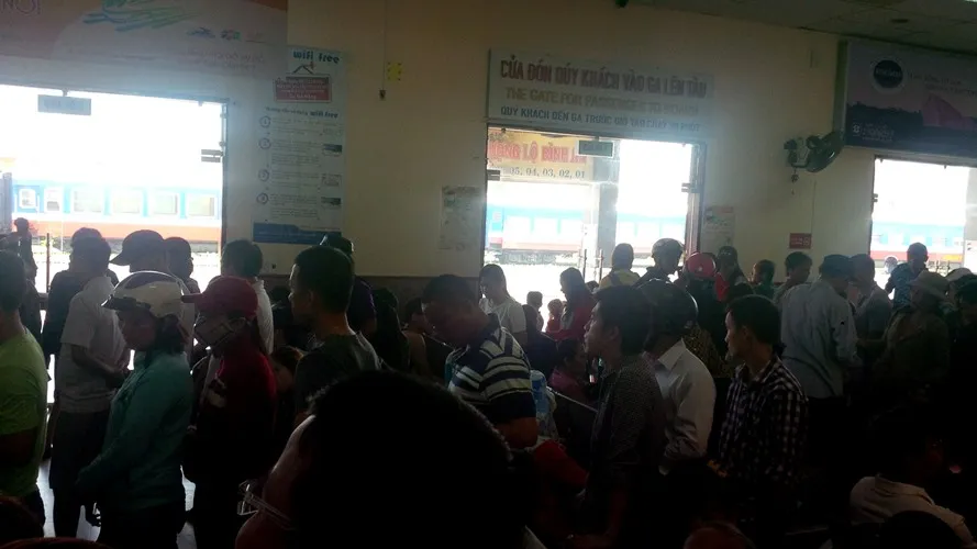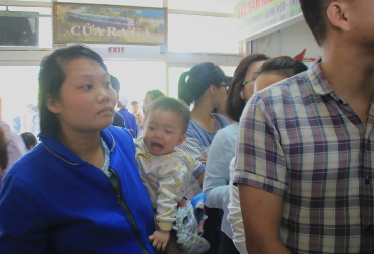 Tiếng trẻ con khóc ré, tiếng than vãn của hành khách khiến cho không khí nhà ga nóng hầm hập, người người nhễ nhại mồ hôi vì chờ đợi.