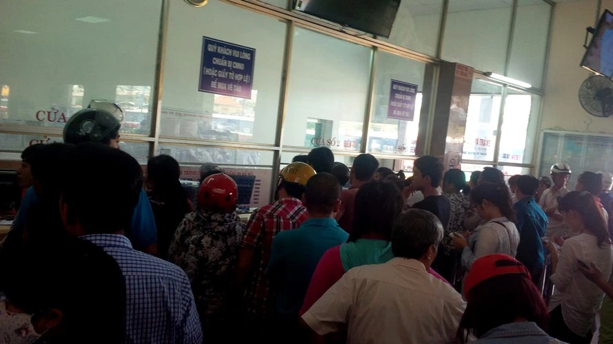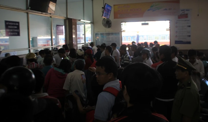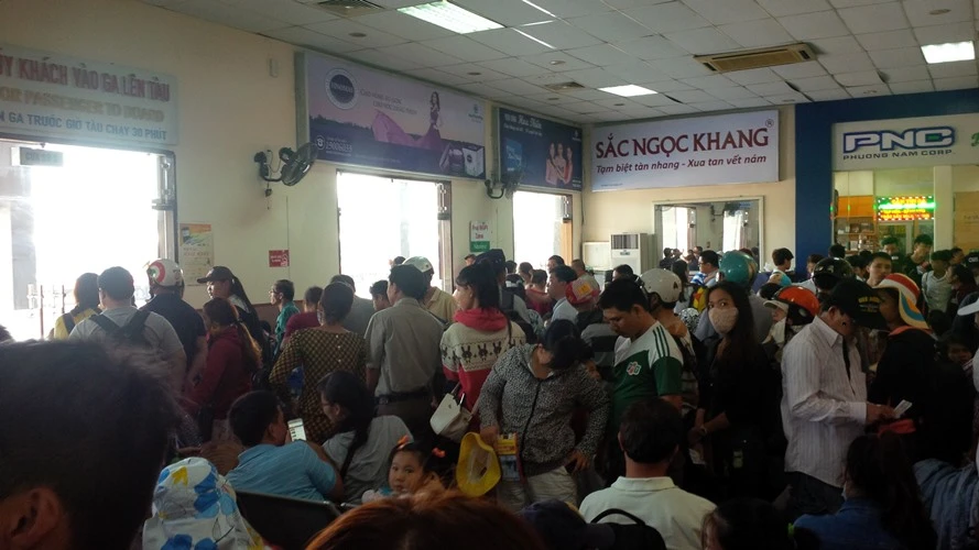 Hành khách đứng chen nhau từng lớp như ướp cá. Trong khi đó, khách đến mua vé phải xếp thành hàng dài từ phòng vé ra tới sảnh đợi trước cổng ga.