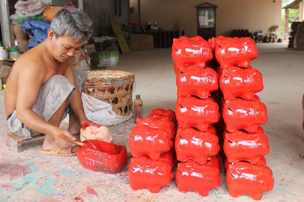 Anh Tâm cho biết nghề làm heo đất đã có mặt từ lâu lắm rồi, có dễ hơn 50 năm. Từ nhỏ anh đã quen thuộc với mùi sơn và các công đoạn làm heo đất như nhào đất sét, đổ khuôn, nung rồi trang trí. Heo đỏ là loại heo truyền thống vẫn còn khách hàng trung thành. Cùng với xu hướng phát triển xã hội hiện đại, làng heo đất nghĩ ra nhiều loại heo với màu sắc và kiểu dáng bắt mắt hơn.