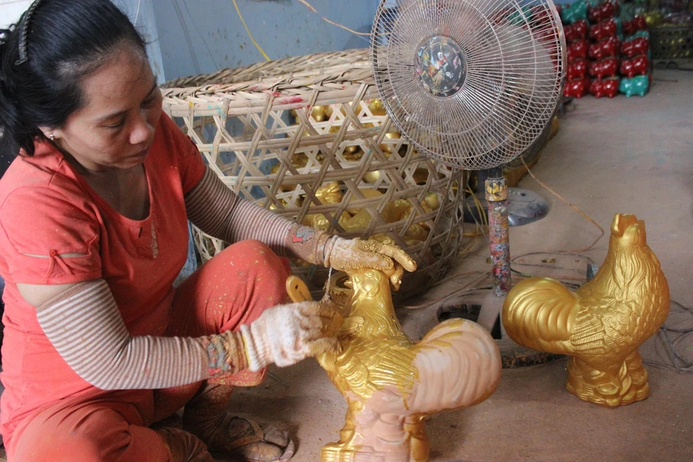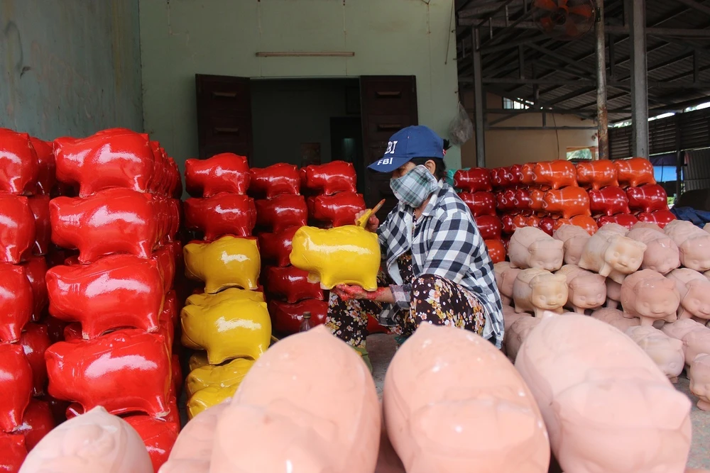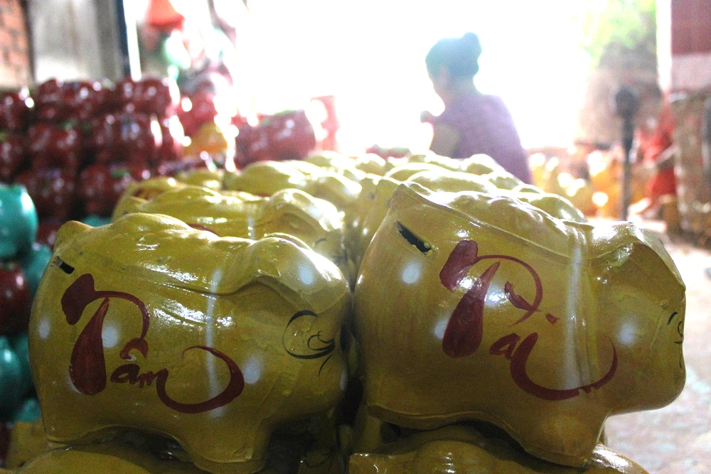 Những ngày này, làng heo đất ở phường Lái Thiêu, thị xã Thuận An, Bình Dương đang khẩn trương trang trí những con gà đất, heo đất với đủ màu sắc để kịp ra mắt thị trường dịp Tết.