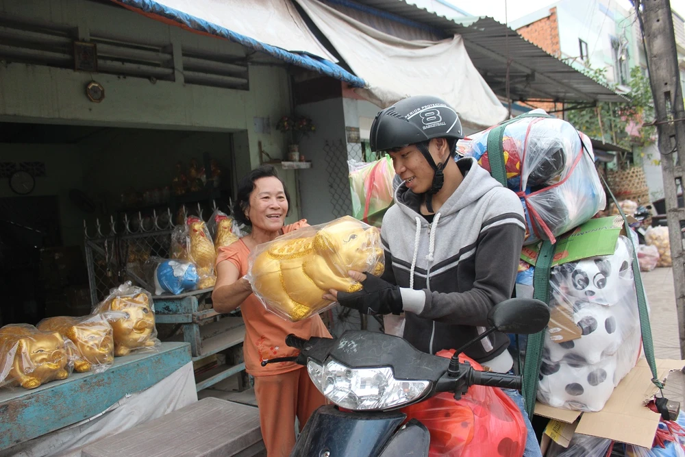 Anh Kỳ, thường bán heo đất ở góc đường Điện Biên Phủ - Cách mạng Tháng Tám, TP.HCM là khách hàng quen thuộc của làng heo đất Lái Thiêu. Anh chia sẻ Tết này sẽ chưa vội về quê Quảng Nam mà ở lại bán heo đất cho dân thành phố du xuân, kiếm ít tiền gửi về cho bố mẹ ở quê ăn Tết.