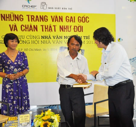 Tác giả Nguyễn Trí (giữa) nhận độc bản Bãi vàng, đá quý, trầm hương do NXB Trẻ tặng. Ảnh: TRÀ GIANG