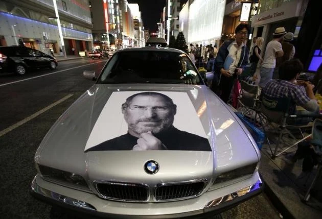 Chân dung của Steve Jobs - nhà đồng sáng lập Apple trên một chiếc xe BMW tại khu mua sắm Ginza, Tokyo. Ảnh: Reuters