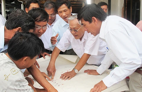 Các cựu binh Trường Sa xem bản đồ về trận chiến Gạc Ma 14-3-1988. Ảnh: TẤN LỘC