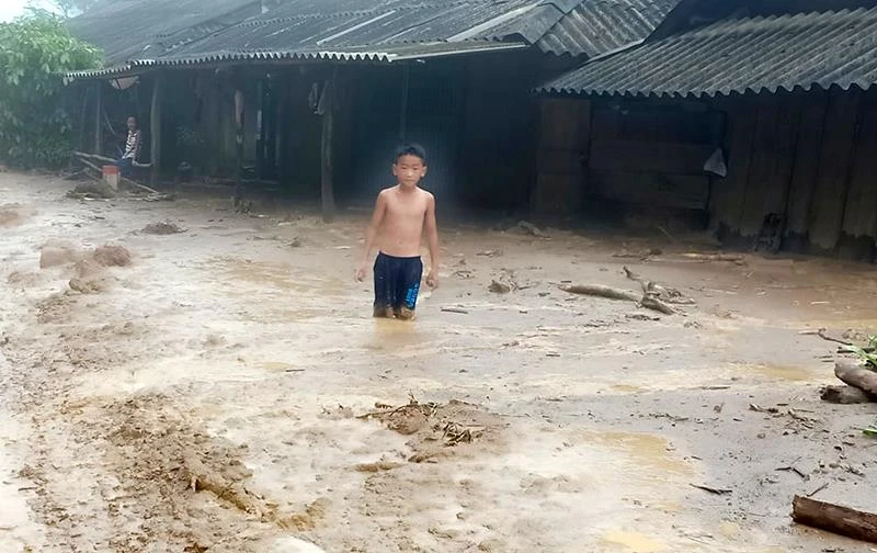 Mưa lũ cũng khiến hàng chục ngôi nhà ở bản Na Tao, Pù Nhi bị bùn đất lấp ngang nhà.