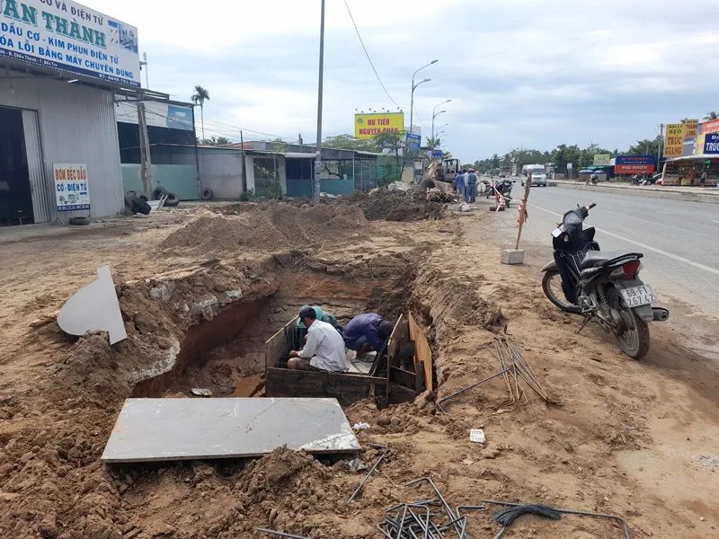 Đơn vị thi công tiến hàng lắp hệ thống thoát nước trên tuyến. Ảnh: ĐH