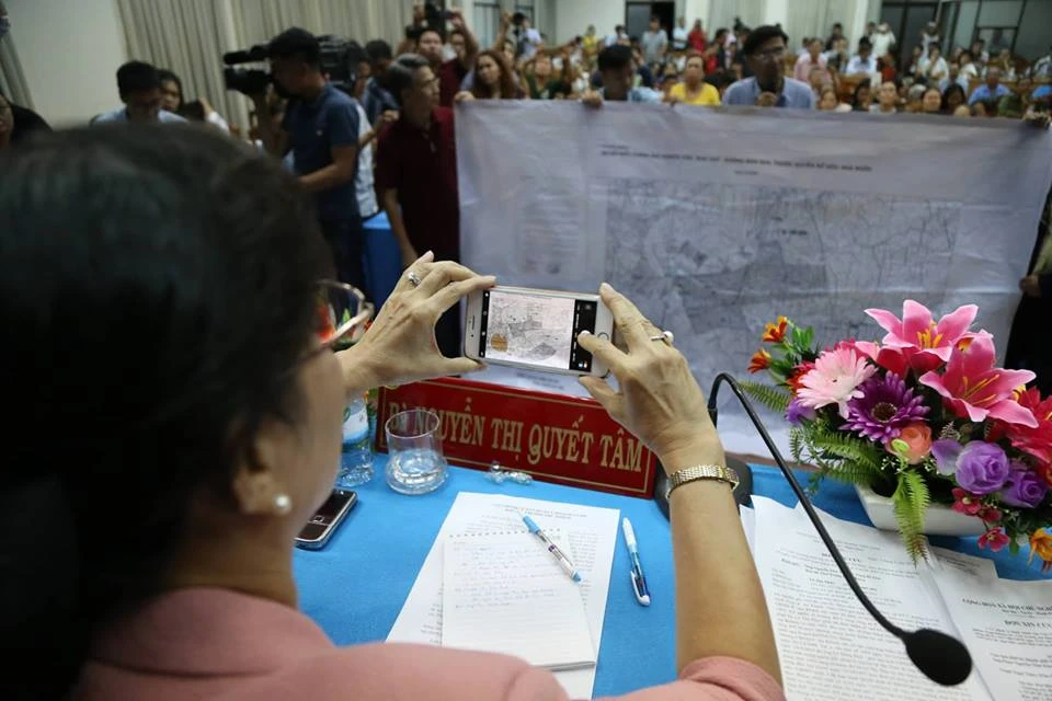 Đại biểu Nguyễn Thị Quyết Tâm chụp lại bản đồ quy hoạch mà người dân trưng ra.