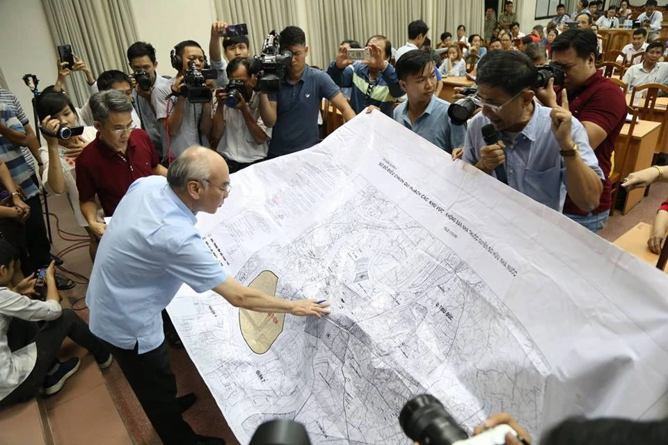 19 giờ, cử tri Nguyễn Hồng Quang trưng ra bản đồ quy hoạch Thủ Thiêm 1/10.000 trong vòng vây người dân và báo chí.