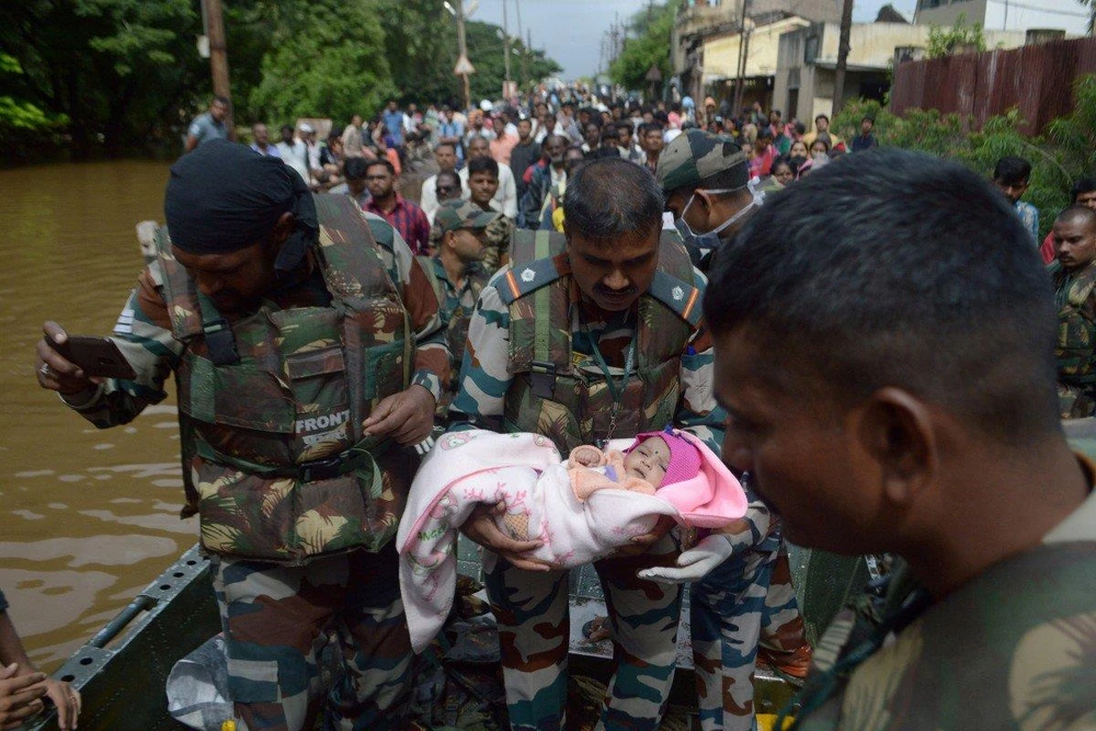 Một người lính bế trẻ sơ sinh trong lúc sơ tán người dân bị ảnh hưởng lũ lụt ở quận Sangli thuộc bang Maharashtra, Ấn Độ. Ảnh: REUTERS