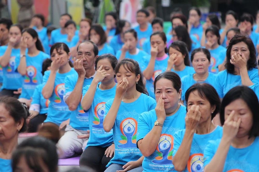 Sau nghi thức thắp đèn truyền thống, những người tham gia từ mọi lứa tuổi, trong những bộ trang phục thoải mái sẽ được huấn luyện viên người Ấn Độ hướng dẫn những đồng tác Yoga cơ bản.