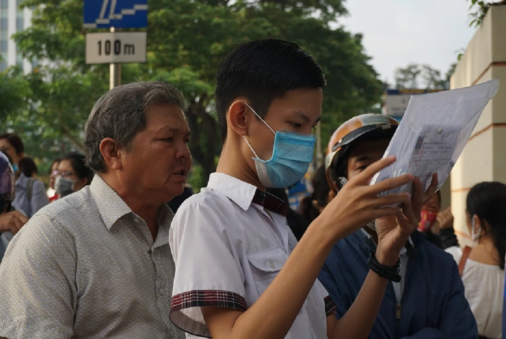 Thí sinh xem ký giấy báo dự thi trước khi bước vào điểm thi. Ảnh: NQ