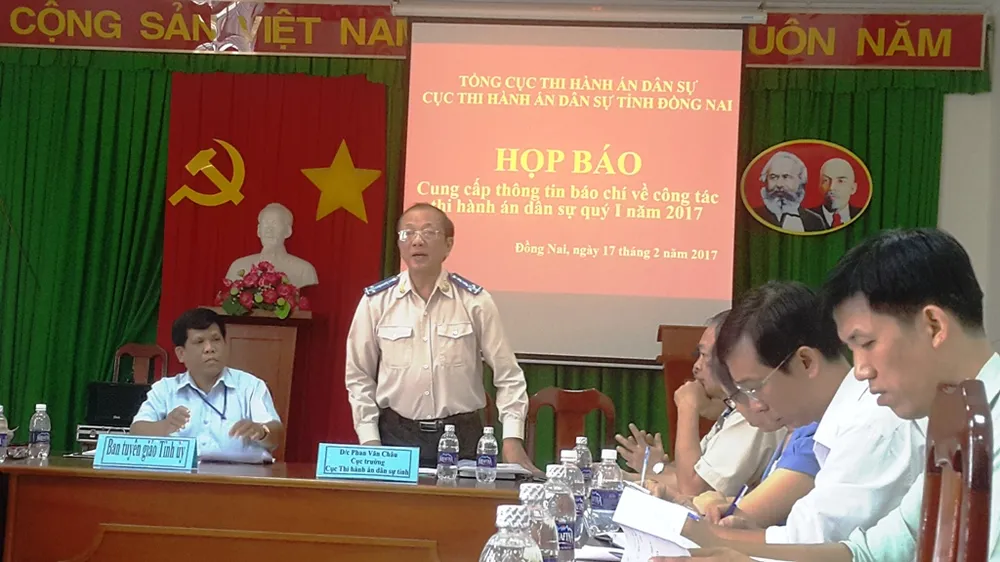 Ông Phan Văn Châu - Cục trưởng Cục THADS tỉnh Đồng Nai thông tin cho báo chí về tình thi hành án trong quý I-2017. Ảnh: TIẾN DŨNG