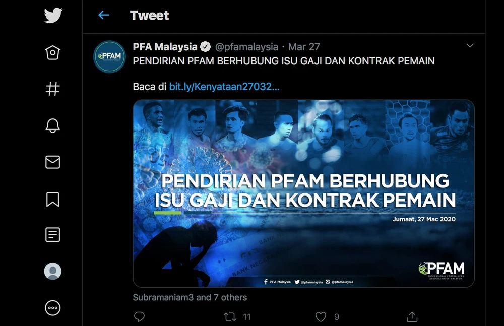Được biết tuyên bố được PFAM đưa ra sau khi Liên đoàn Bóng đá Malaysia (FAM) lên tiếng kêu gọi các đội bóng và cầu thủ hưởng ứng việc cắt, giảm lương trong thời gian giải VĐQG nước này tạm hoãn vì đại dịch COVID-19.