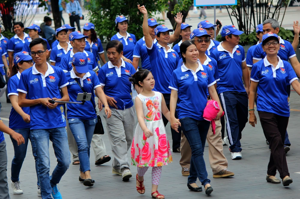 Người tham gia vui vẻ đi bộ trên phố Nguyễn Huệ.
