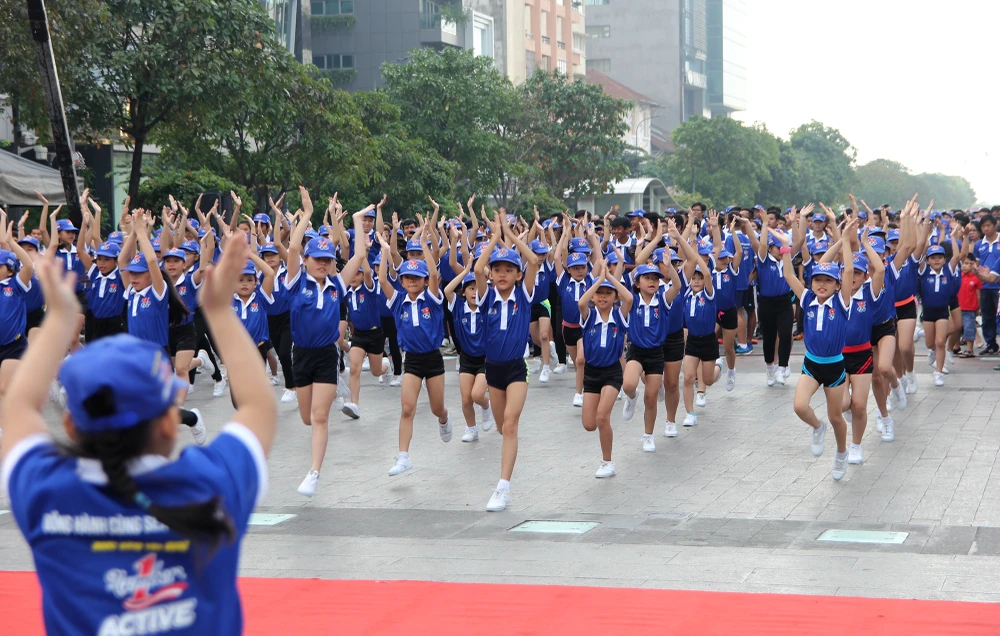 Các em nhỏ tham gia đồng diễn thể dục thể thao.
