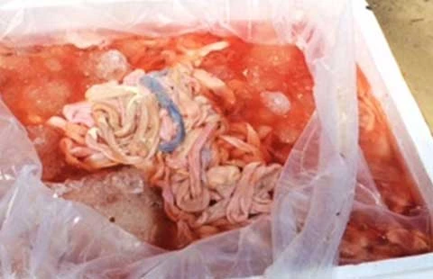 Số nội tạng hôi thối này đang trên đường vận chuyển vào Nam tiêu thụ. Ảnh: HT